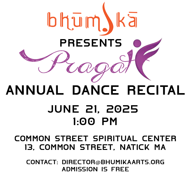 Join Bhūmikā for Pragati: Our Annual Dance Recital on June 21, 2025, at 1:00 PM. Our dedicated students have worked incredibly hard to showcase their learning and talent! Experience an enchanting performance at the Common Street Spiritual Center, located at 13 Common Street, Natick, MA. Admission is free, and we welcome everyone to enjoy this special event. For more details, please contact DIRECTOR@BHUMIKAARTS.ORG.